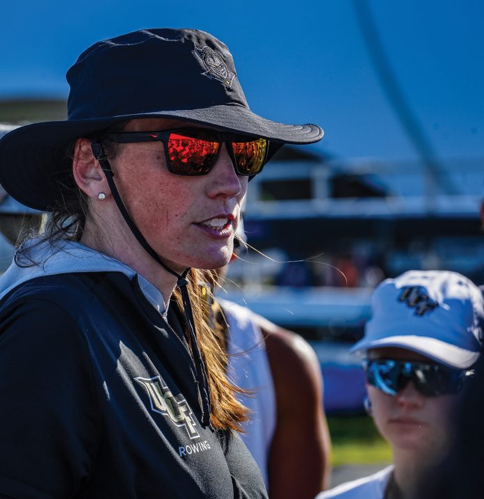 UCF hired Mara Allen away from Texas, where she was an assistant coach, in the summer of 2023. Earlier this spring Allen coached the Knights to a sweep of the Big 12 Championships, winning every race by open water, included a 16.8-second margin in the first eight final. UCF enters the NCAA regatta ranked 14th.
