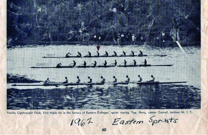 The 1962 three-way tie is unique. Perhaps some alert reader will correct me, but I’ve never heard of another rowing race with a three-way tie for first place. A contemporary account (“the most exciting race at the EARC Sprints”) called it this way: