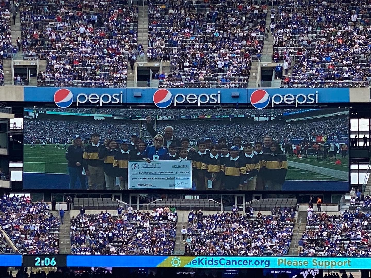 The San Miguel Rowing Program was honored by the NY Giants at MetLife Stadium October 16 as part of Hispanic Heritage Month. San Miguel rowers were invited onto the field during a timeout and presented with the “Local Latino Achievement Award.” Ann Mara Cacase, representing the Mara Family and the Giants Organization, presented San Miguel Rowing with a check for $25,000 wearing a special ‘San Miguel’ Giants jersey. San Miguel Rowing, part of San Miguel Academy of Newburgh, is one of the largest hispanic rowing programs in the country. Last June, San Miguel Academy rowers placed 11th overall at the USRowing National Youth Championships in Sarasota, Florida after qualifying for Nationals in May with a solid first-place finish in the U15 quad division at the USRowing Northeast Youth Championships in Lowell, Massachusetts. The Northeast is one of the most competitive divisions in the country.