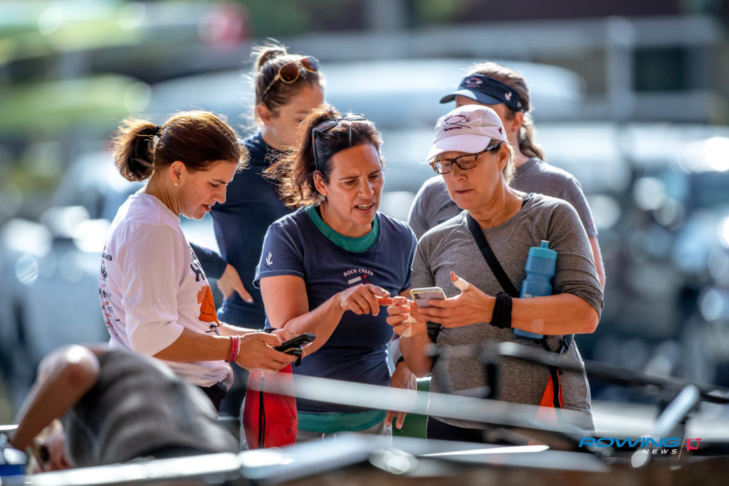 All morning and into the afternoon, team trailers and crews arrived, rigged boats, and as soon as the racing finished began getting on the water for a practice row.