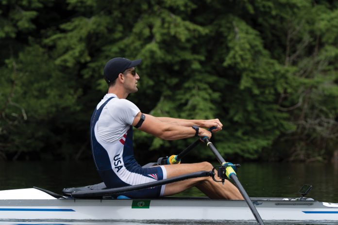 Like almost every U.S. National Team rower, sweep oarsman-turned-Olympic-single-sculler Jacob Plihal hits the water with an NK SpeedCoach, a heart-rate monitor, and a GPS watch. He’s also added a new system from start-up XBoat, a company led by former collegiate lightweight oarsmen Jordi Cabanas (Princeton ’19) and Tom Lee (Yale ’90). XBoat amasses a large amount of data similar to what Peach provides and also measures force at the pin with a replacement oarlock.