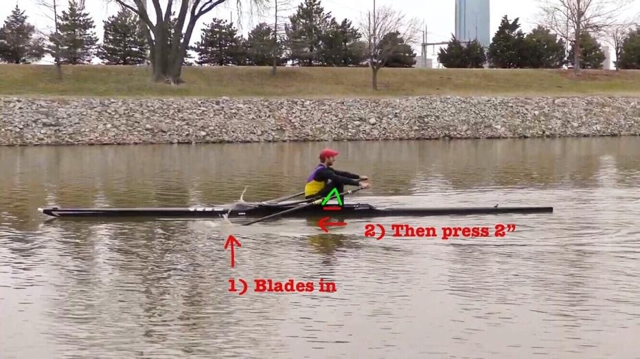 - Starting from the catch position, blades squared and buried, press into the footboard using the legs just two inches down the slide. This will be about when the heels touch the footboard. The upper body will remain in the forward angled position, shoulders relaxed.