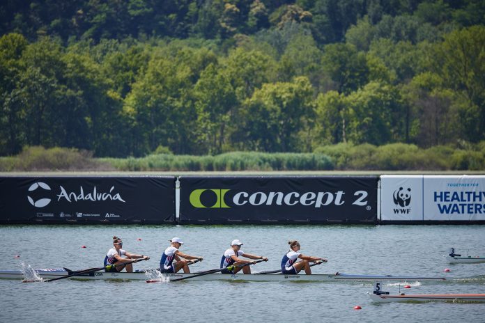 The two fours combined into an eight coxed by Olympian Nina Castagna to finish second to the Brits. Level with Australia and trailing both Germany and Great Britain through the first half of the race, the U.S. crew closed the gap to two seconds at the line, leaving Australia (third) and Germany (fourth) behind. Italy’s women’s eight missed catching Germany by .01 second. China finished sixth of the six total entries.