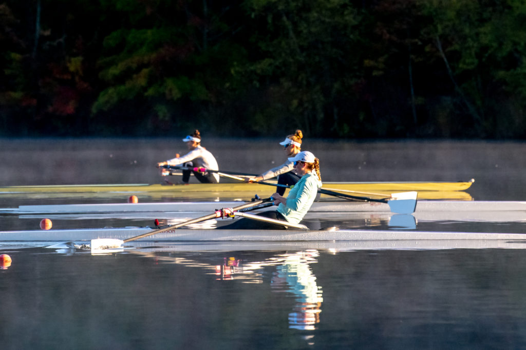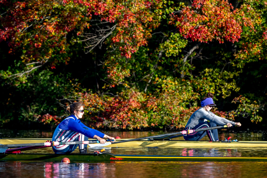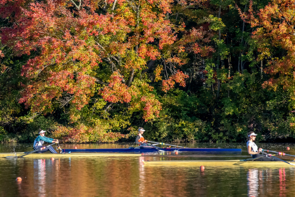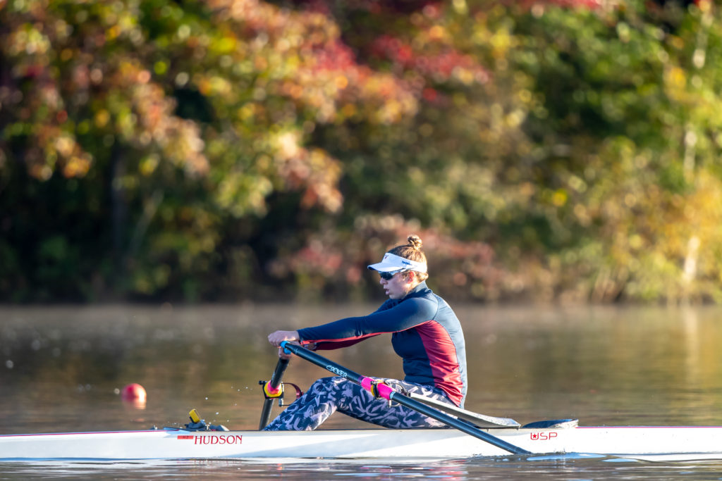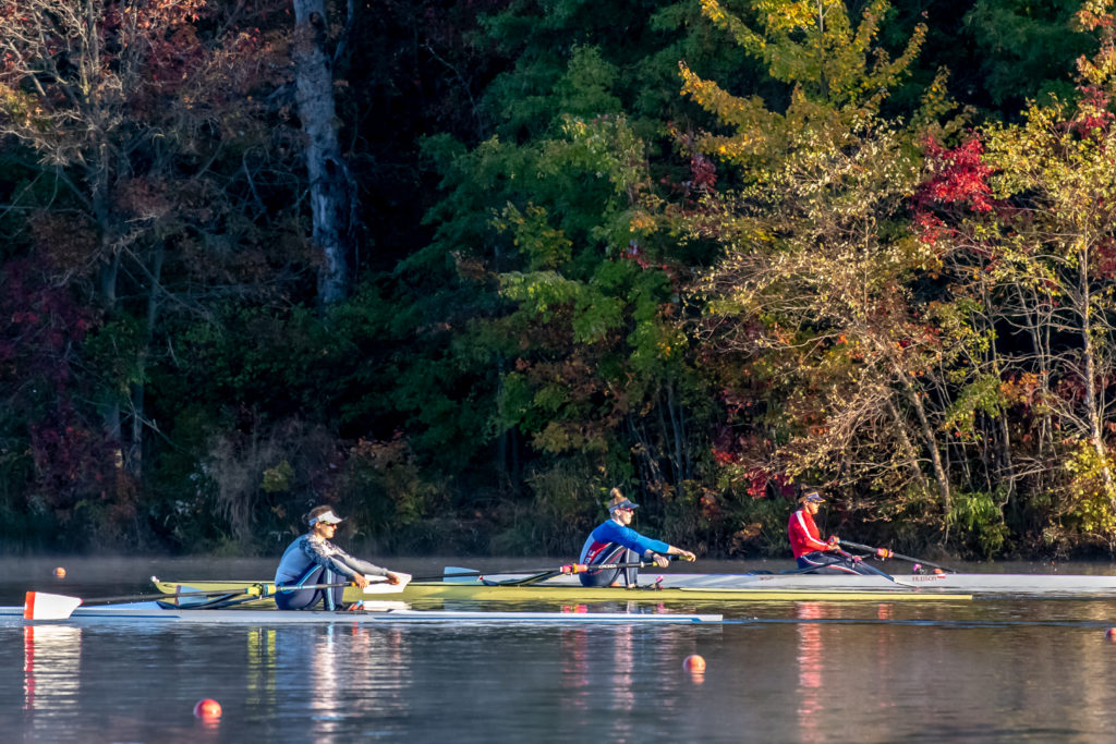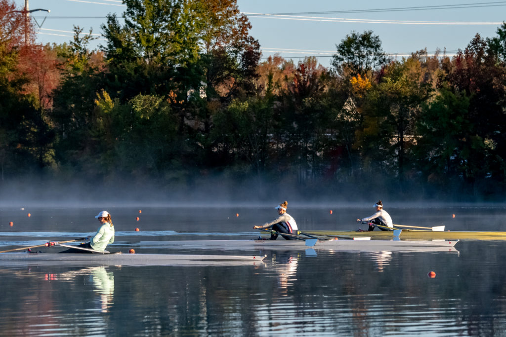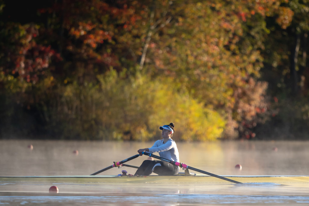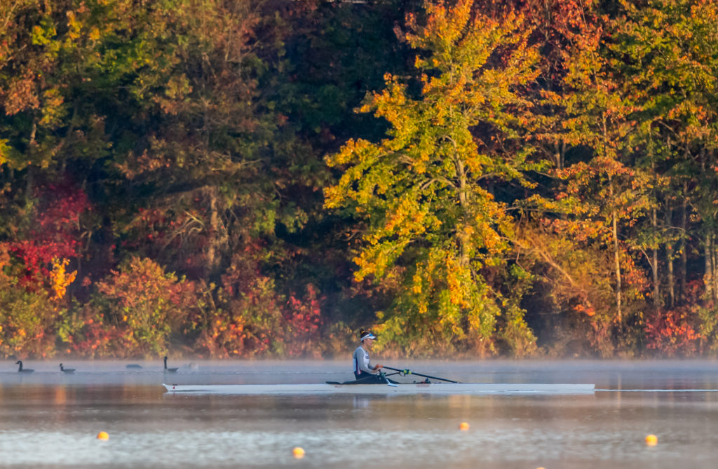 Racing and rowing in team boats is still on hold through, but the United States women’s training center is back at work and training in singles on Mercer Lake in West Windsor, N.J. and on Wednesday morning several of the team was on the water enjoying a colorful and perfect for sculling fall morning.